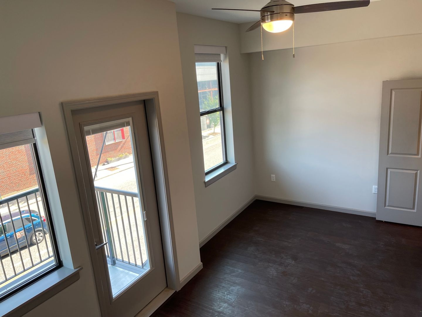 - White Aluminum Blinds and Ceiling Fans