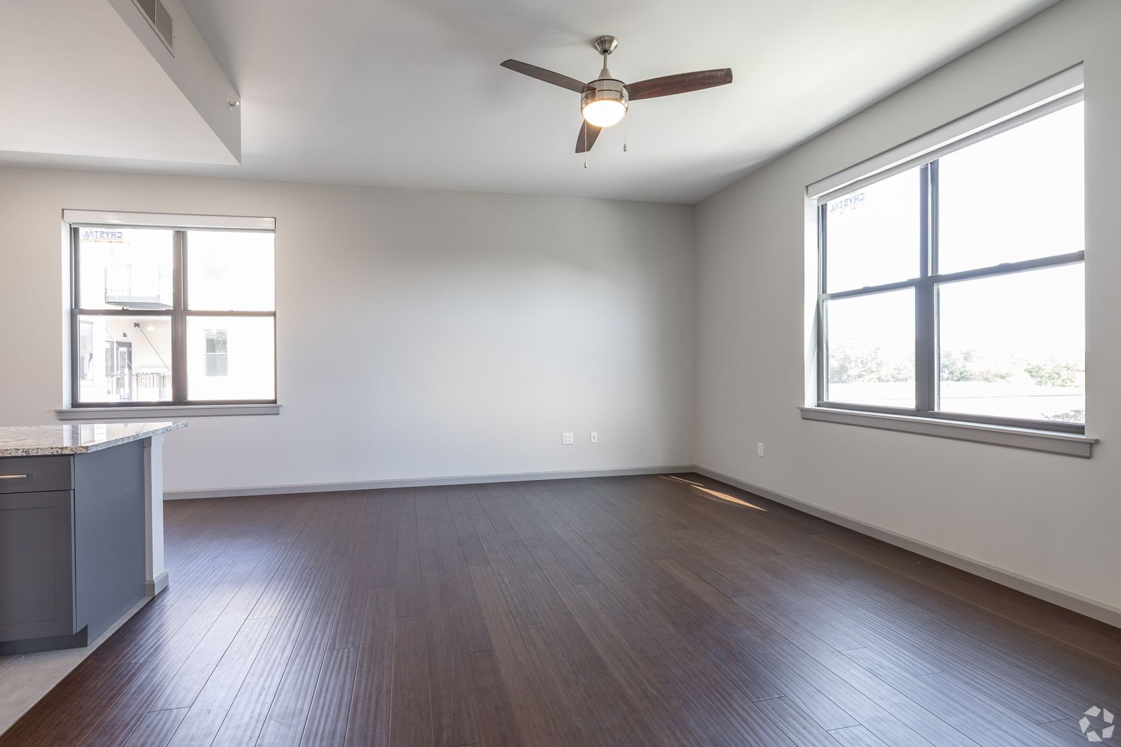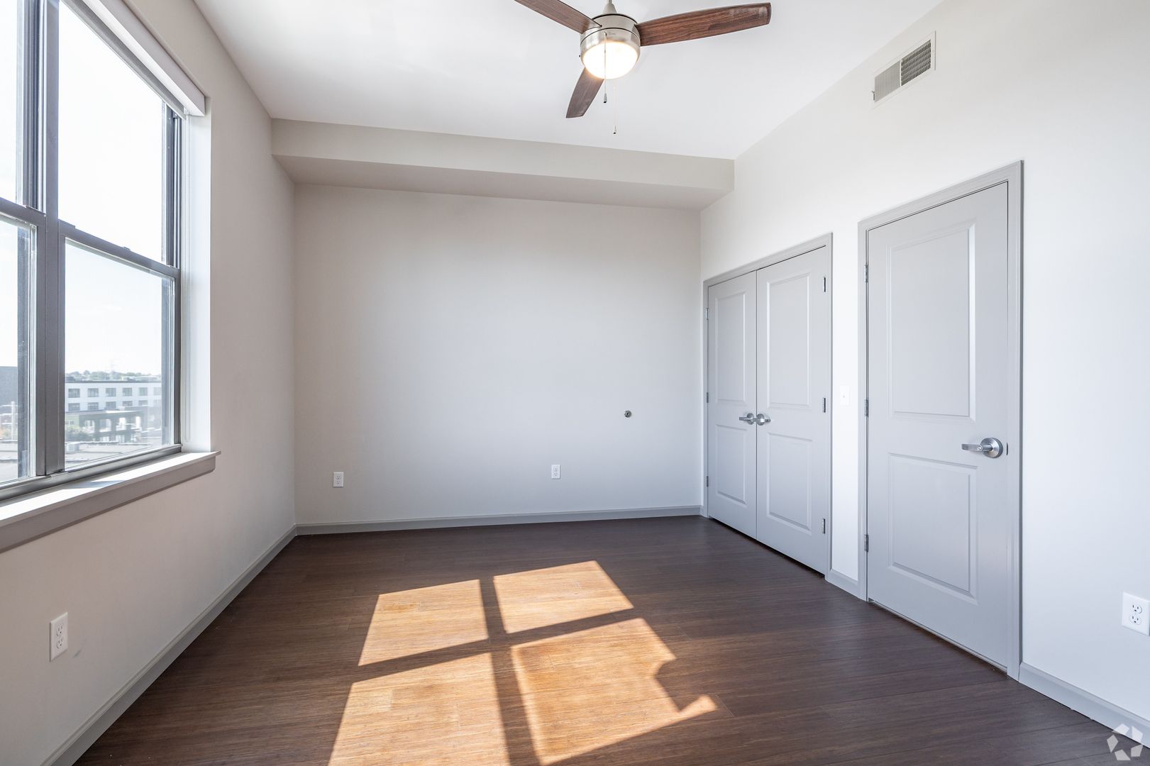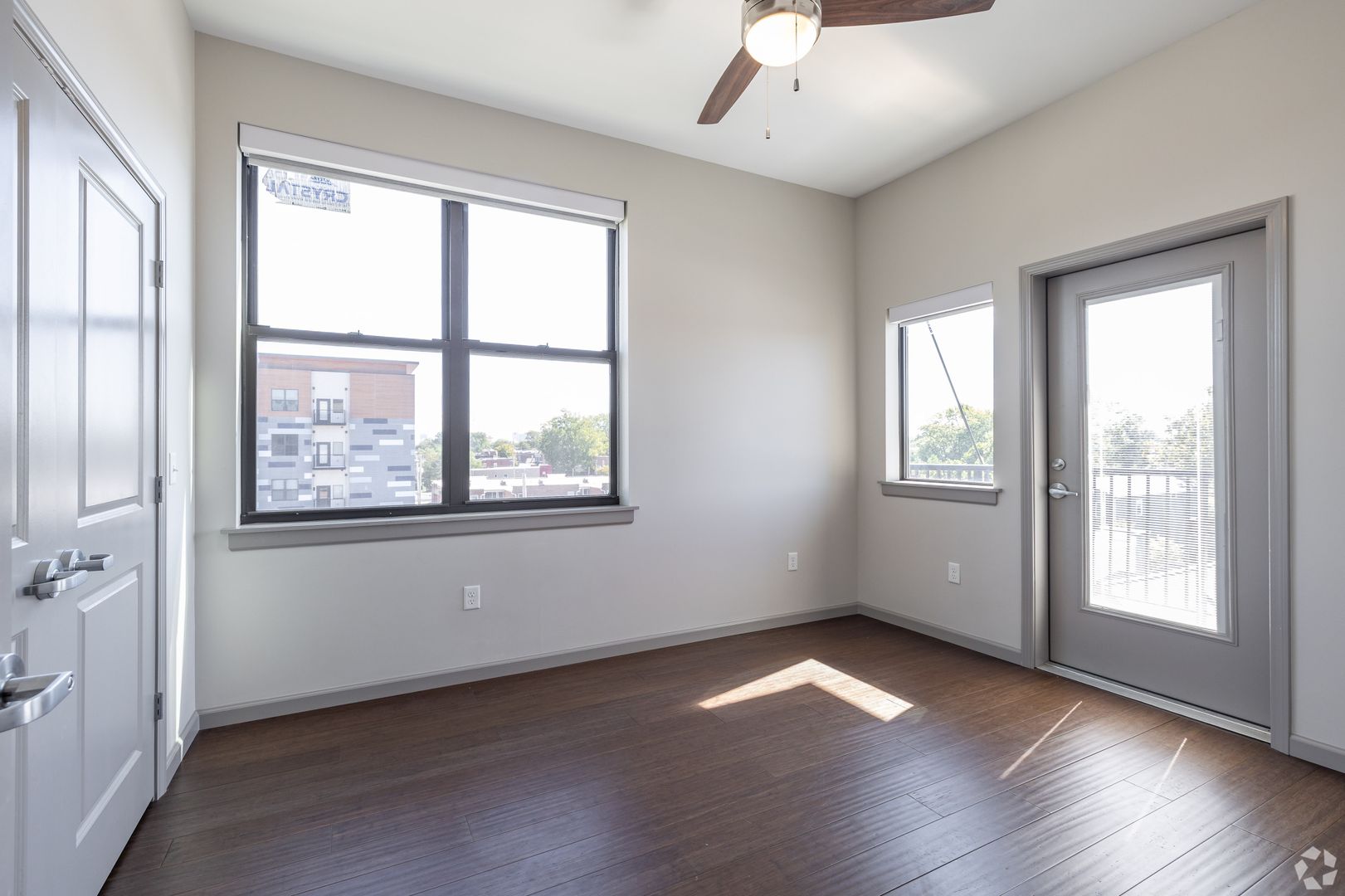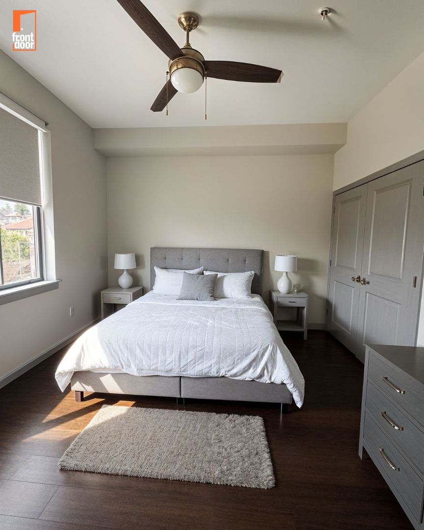 - White Aluminum Blinds and Ceiling Fans