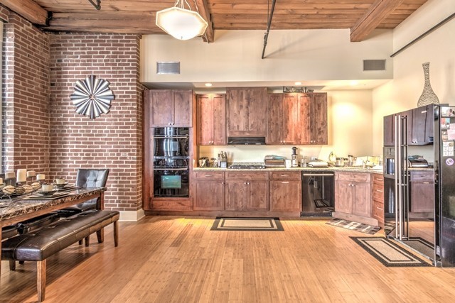 Features include polished bamboo floors, high ceilings, massive windows, in-unit washer dryer in the dedicated laundry with sink and additional storage, central HVAC, fire place, secured building access, and garage parking!